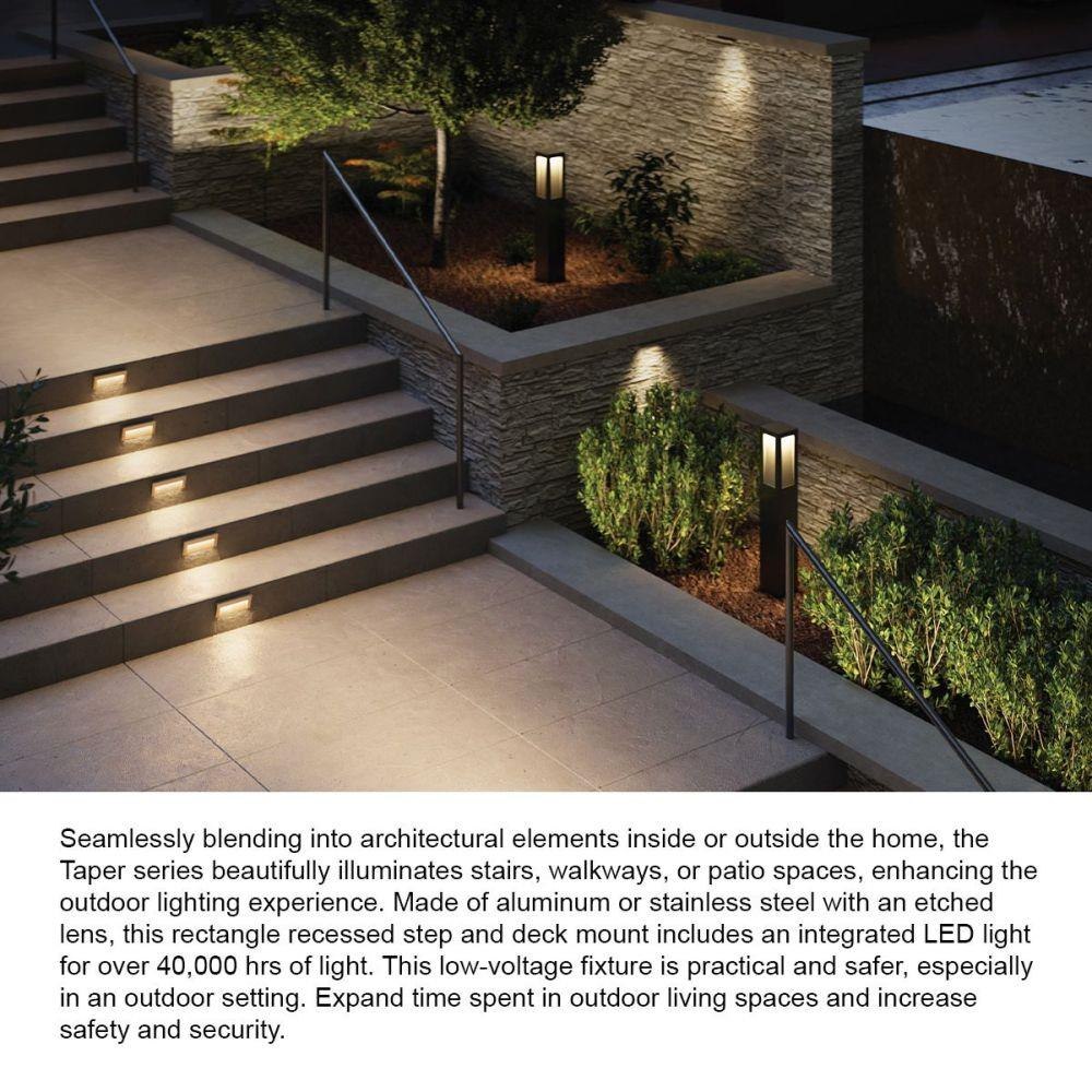 The Taper step light mounts recessed with a 1/8-inch deep bezel, enabling a flush and subtle installation into decks or walls. Installation efficiency is enhanced by the supplied wiring kit, while the fixture requires a compatible transformer for operation on a 12-volt low-voltage system. Its design allows fewer fixtures to illuminate larger areas, providing versatile mounting options for enhanced outdoor lighting coverage.