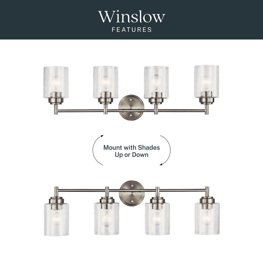 The modern Winslow 4-light 30in. bath light in a Black finish with Clear Seeded glass shade pair beautifully with the linear arms, bringing light and dimension to a space.