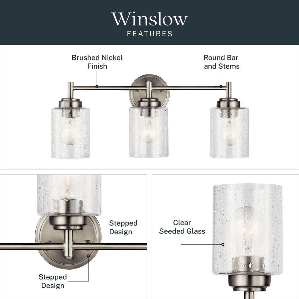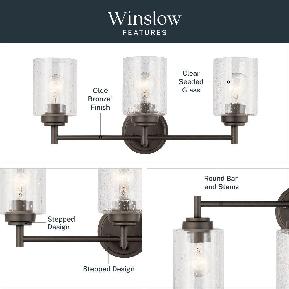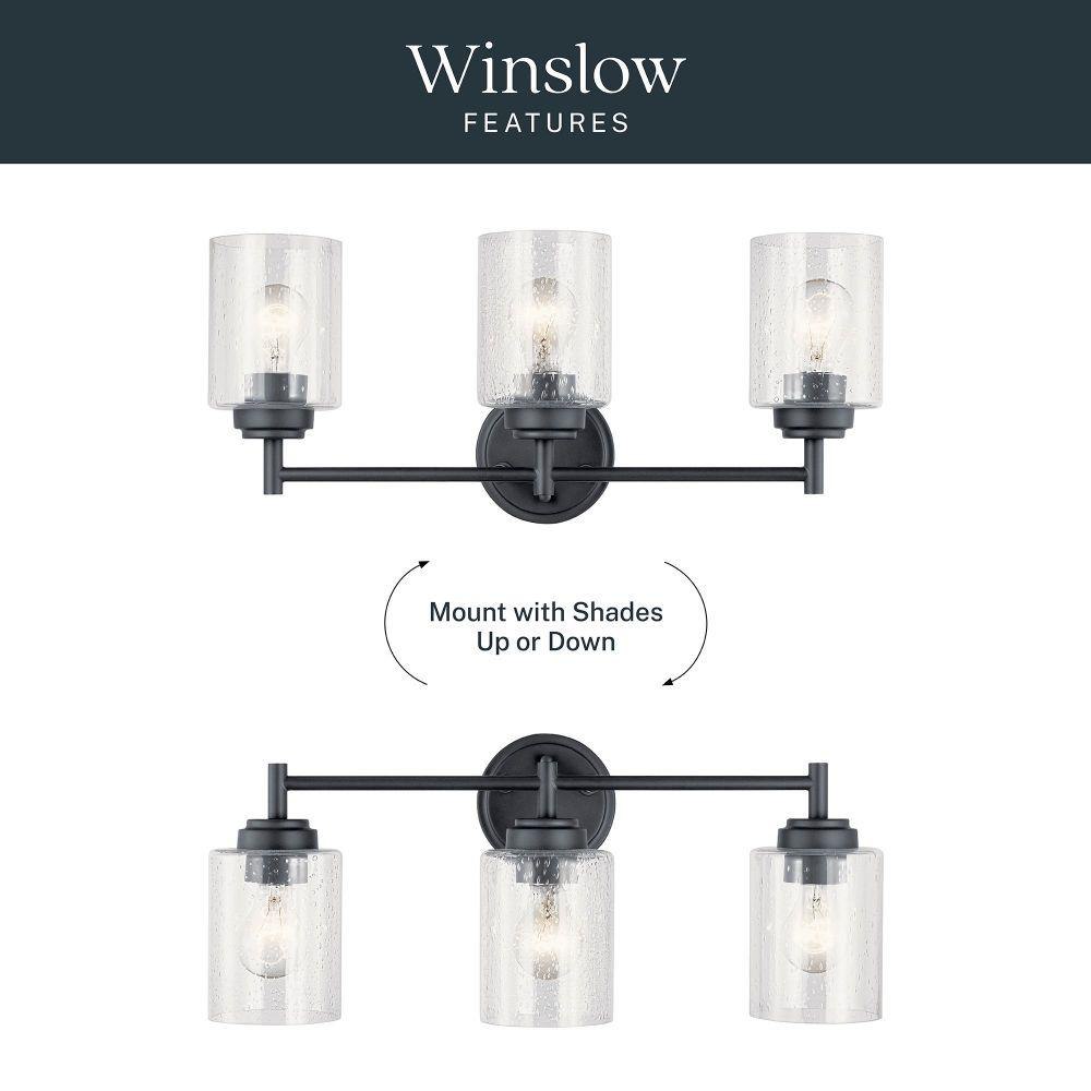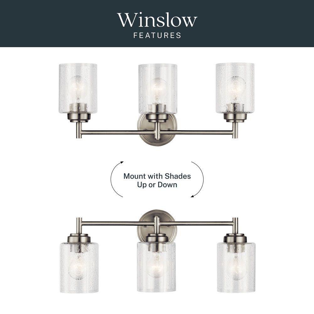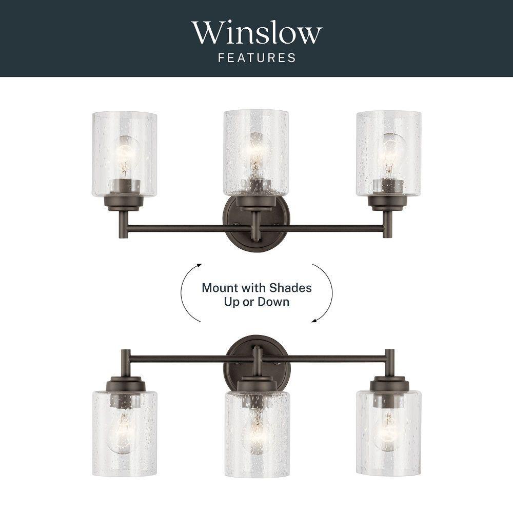 The modern Winslow 3-light 21.5in. bath light with Clear Seeded glass shade pair beautifully with the linear arms, bringing light and dimension to a space.